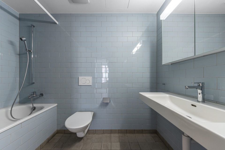 • Badzimmer mit Lavabo, WC, Badwanne und Spiegelschrank